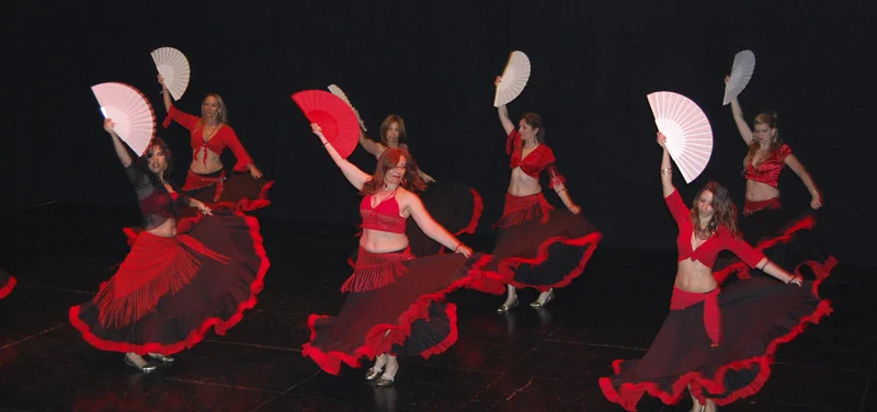 舞者身穿肚皮舞服裝,以紅黑為主要色調,有些舞者更會運用佛朗明哥扇(abánicos) 和披肩(mantón)作道具。佛朗明哥風肚皮舞也就充滿熱情浪漫而神秘性感,滲透著致命的誘惑。